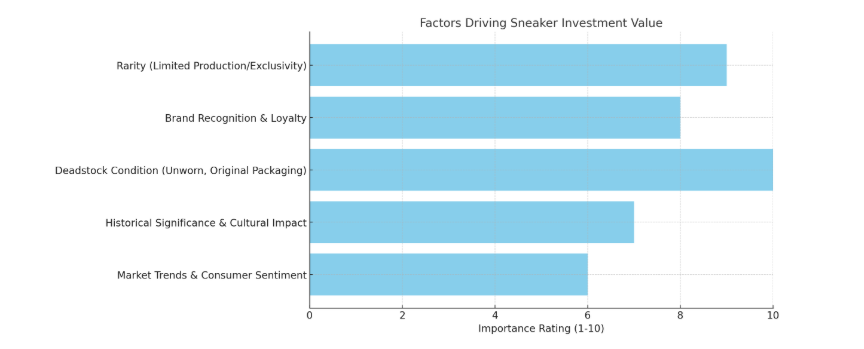 Here's a bar graph representing the factors driving sneaker investment value. Each factor is rated on a scale from 1 to 10 based on its importance: