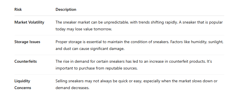 Like investing in stocks, sneaker investing has risks—the market can fluctuate, and trends can change in a snap. Of course, storage issues could damage the sneakers if they're not in the right environment. Due to high demand, there's a danger of counterfeiting, and there are questions about liquifying an asset if you want to, as it might not always be an easy or quick sale.